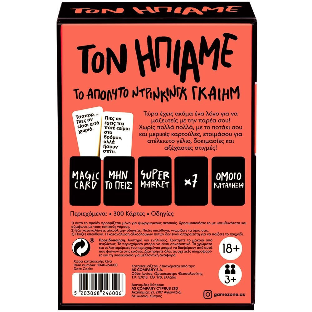 Το απόλυτο «Ντρίνκινγκ Γκέιμ!» είναι εδώ και υπόσχεται να ανεβάσει τη διάθεση στα ύψη! Τώρα έχεις ακόμα έναν λόγο να μαζευτείς με την παρέα σου και να περάσετε αξέχαστες βραδιές. Βάλε το αγαπημένο σου ποτό, μοίρασε τις κάρτες, και ετοιμάσου για ένα παιχνίδι γεμάτο γέλιο, ανατρεπτικές δοκιμασίες και στιγμές που θα μείνουν χαραγμένες στη μνήμη σας.