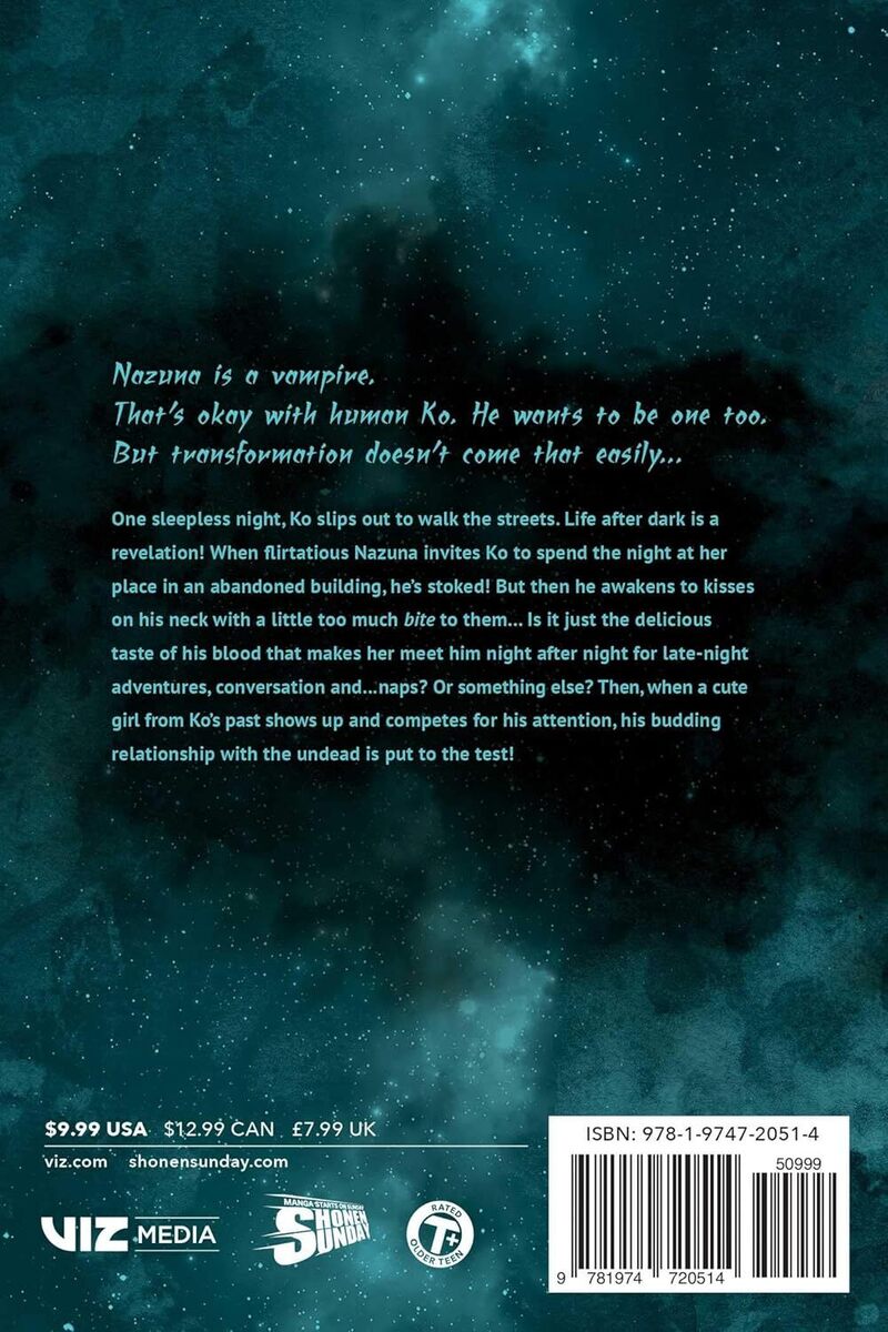 One sleepless night, Ko slips out to walk the streets. Life after dark is a revelation! When flirtatious Nazuna invites Ko to spend the night at her place in an abandoned building, he's stoked! But then he awakens to kisses on his neck with a little too much bite to them... Is it just the delicious taste of his blood that makes her meet him night after night for late-night adventures, conversation and...naps? Or something else? Then, when a cute girl from Ko's past shows up and competes for his attention, his budding relationship with the undead is put to the test!