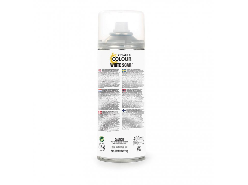 White Scar Spray is designed for basecoating plastic, resin and metal Citadel miniatures. Reformulated to have the same silky-smooth texture as Grey Seer and Wraithbone - ideal for Contrast - it works with any paint!