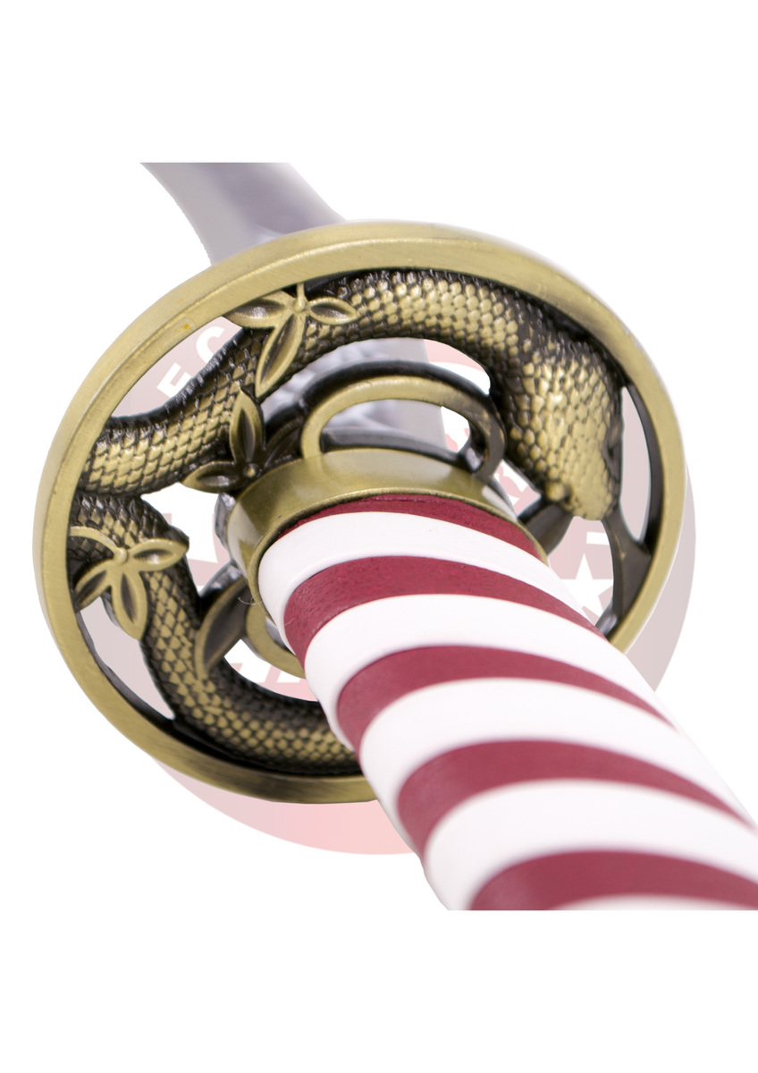It is a replica of the sword that Obanai Iguro carries during the episodes, measuring a total of 104 cm and with a dull steel blade finished in worn black with a satin cut , a handle with maroon and white leatherette cording , a tsuba with two snakes , and a black leatherette scabbard .
