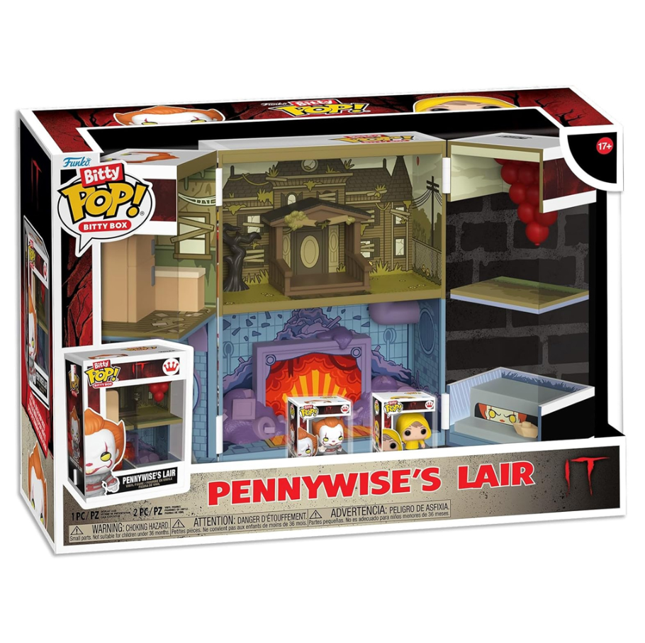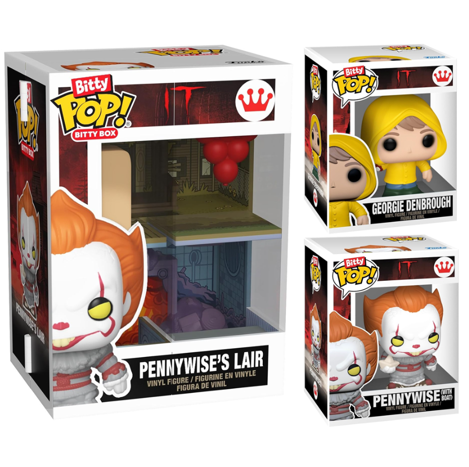 The world of POP! is getting bigger-and smaller-with Bitty POP! collectibles! Expand your IT collection with the Bitty POP! Bitty Box Pennywise's Lair! This hard acrylic display case is modeled to resemble a POP! box and opens to reveal iconic rooms from around Pennywise's Lair. This collectible also includes Bitty POP! Pennywise and Bitty POP! Georgie Denbrough!