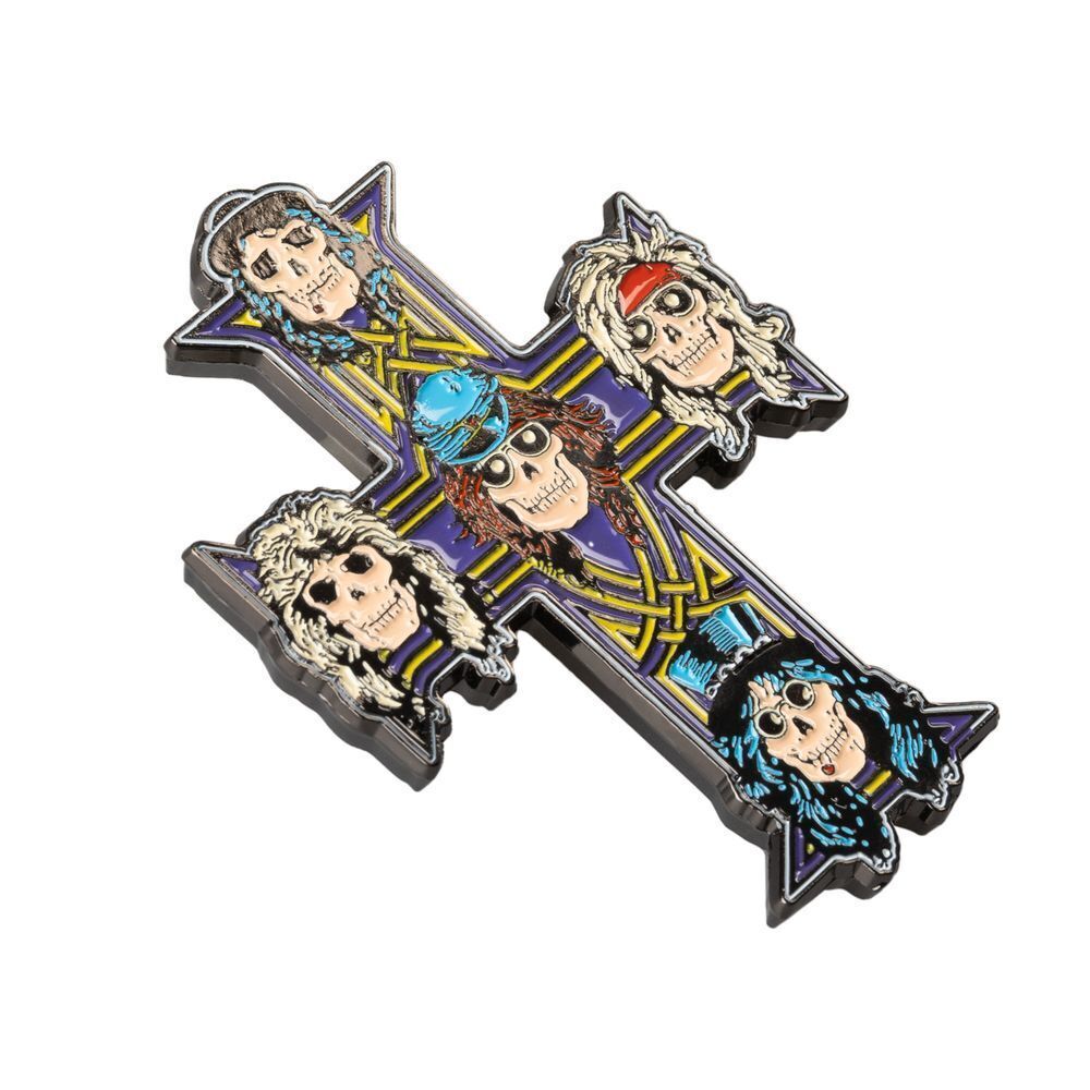 Showcasing the iconic cross with five skulls representing each band member from Appetite for Destruction, this fridge magnet is a striking tribute to Guns N' Roses.