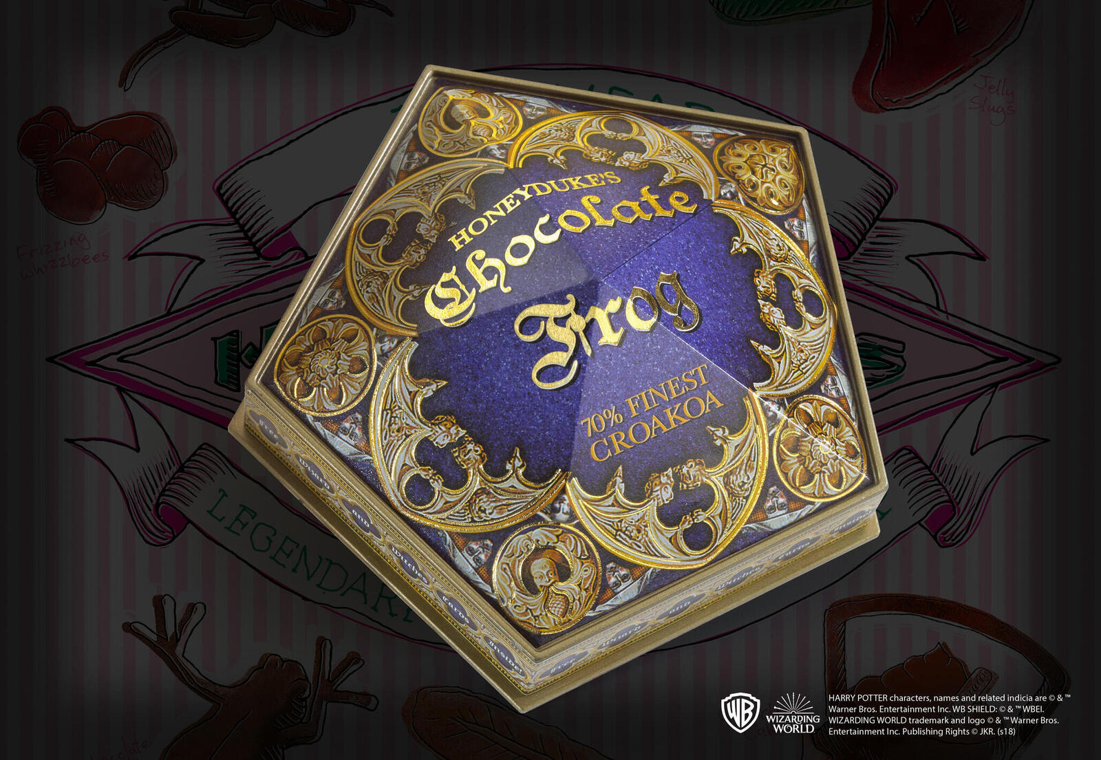 A non-edible Chocolate Frog prop replica. Squash it, stretch it, squish it, or just admire it on your desk. Includes a detailed keepsake box and a Dumbledore Famous Witches and Wizards Card.