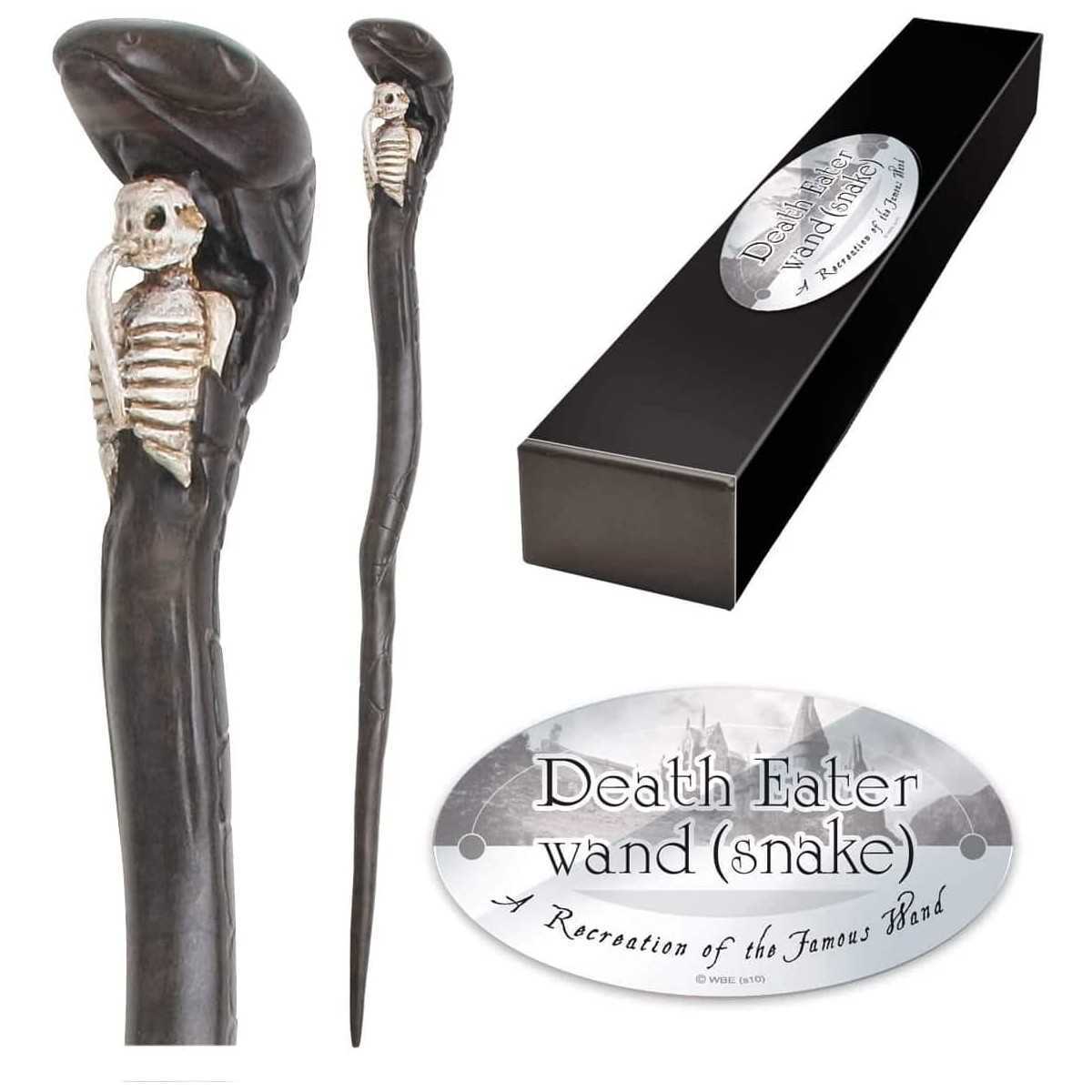 A Death Eater's wand in an intricate snake and skeleton design. Character box contains name clip. Wand measures approx 34cm.