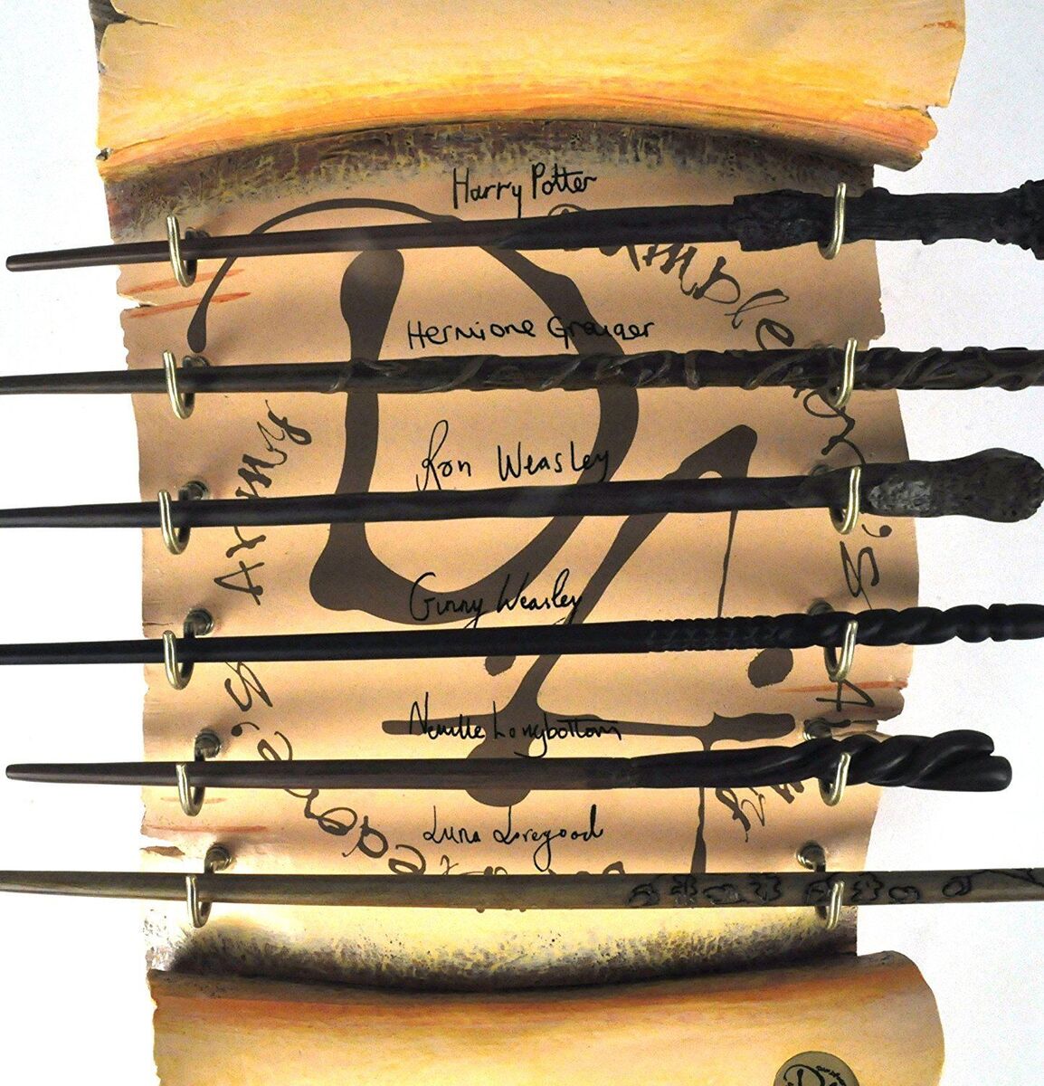 A hanging wall plaque with the wands of Harry Potter, Hermione Granger, Ron Weasley, Ginny Weasley, Neville Longbottom and Luna Lovegood, core members of Dumbledore's Army. Measures approximately 17″ in height.