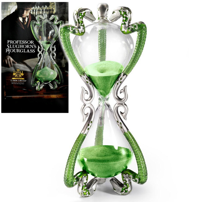 A striking prop replica of Professor Horace Slughorn's famous vibrant green hourglass. While this is a functioning replica, it is a very fragile product with thinly sculpted glass, so we recommend that you take great care when handling it.