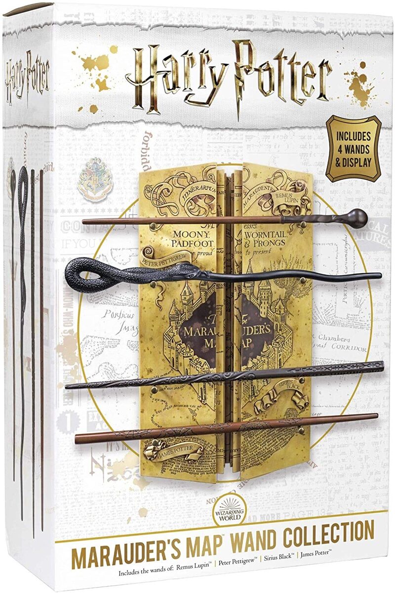 The wands of the four Marauders, Remus Lupin, Peter Pettigrew, Sirius Black and James Potter, on a hand-painted resin Maruaders Map display (measuring approx 36 x 21cms).