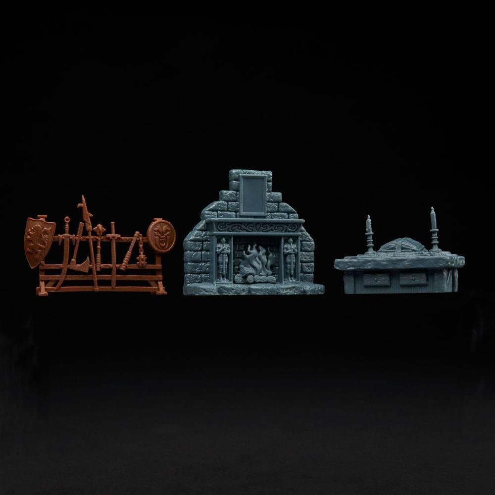 Includes gameboard, 31 monster miniatures, 4 hero miniatures, 15 furniture pieces, 10 skull pieces, 4 plastic rat pieces, 21 dungeon doors, 93 game cards, 4 turn-order cards, cardboard tiles, Quest Book, 4 character cards, Game Master's screen, pad of character sheets, 6 white combat dice, 2 red dice, and rulebook.