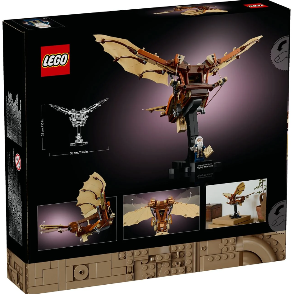 Explore the evolution of aeronautical innovation or gift a history-lover with the LEGO Icons Leonardo da Vinci's Flying Machine (10363) home and office desk decor building set for adults. Craft a detailed model of da Vinci's visionary ornithopter featuring an open airframe with flappable textile-covered wings driven by a visible interplay of string, hinges and pulleys. This captivating centrepiece includes a display stand with an attachable Leonardo da Vinci minifigure holding a quill and sketch.