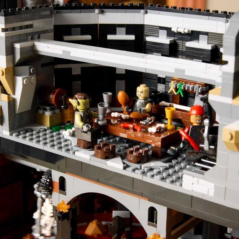 The 1st-floor interior includes Gollum's hideout, a weapons forge and a prison with a raisable Orc cage. Above the 2nd-floor dining area you'll find a room with a throne that opens to reveal a hidden map of Middle-earth. The 4th floor is home to Mouth of Sauron's study, while the 5th floor houses a tower library with a rotating ladder. The black gate is automated and the Eye of Sauron illuminates for a captivating display.
