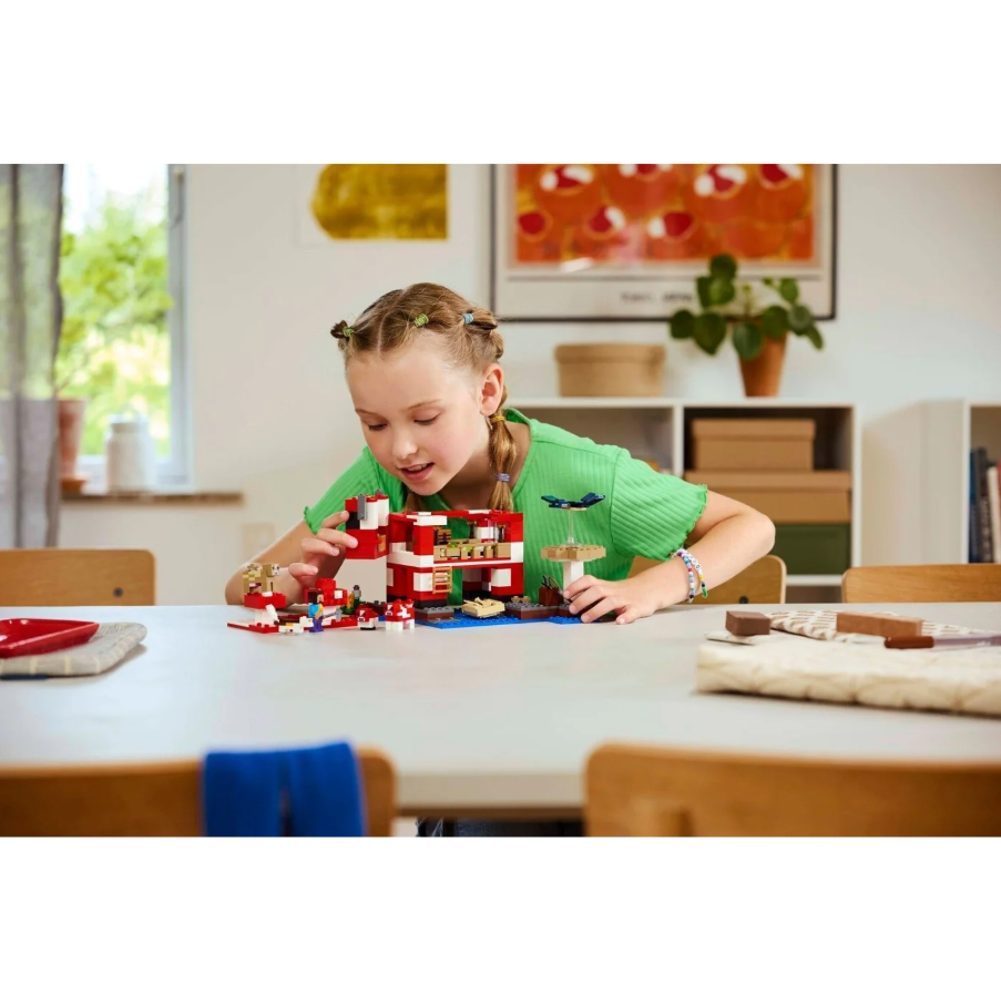 Αυτό το παιχνίδι LEGO® Minecraft® είναι ιδανικό για παίκτες Minecraft και παιδιά που αγαπούν να κατασκευάζουν σπίτια, να φροντίζουν ζώα και να αποκρούουν εναέριες επιθέσεις! Αυτό το απίθανο σετ παιχνιδιού είναι εξαιρετικό δώρο Minecraft για κορίτσια και αγόρια ηλικίας 8 ετών και άνω. Με σκηνικό το νησί μανιταριών, αυτό το παιχνίδι κατασκευής σπιτιού LEGO Minecraft περιλαμβάνει τον δημοφιλή χαρακτήρα Steve καθώς και μια κόκκινη, καφέ και μωρό mooshroom, γάτα κάλικο και το εχθρικό ιπτάμενο στοιχειό. Το σετ παιχνιδιού είναι γεμάτο με στοιχεία που περιλαμβάνονται στο βιντεοπαιχνίδι, όπως μια μικρή περιοχή φάρμας με σιτάρι, μανιτάρια και ένα φυτό νηπενθές που φυτρώνει δίπλα σε έναν κομποστοποιητή. Τα αξεσουάρ περιλαμβάνουν καλάμι ψαρέματος, ψάρι, τσάπα, σπαθί, μπολ, βάρκα με κουπιά, σεντούκι, καμίνι, τραπέζι κατασκευών, ράφι βιβλιοθήκης, ψωμί και κρεβάτι. Η εφαρμογή LEGO Builder προσφέρει στα παιδιά επιπλέον διασκέδαση χρησιμοποιώντας τις συσκευές τους για να ζουμάρουν και να περιστρέφουν μοντέλα σε 3D.