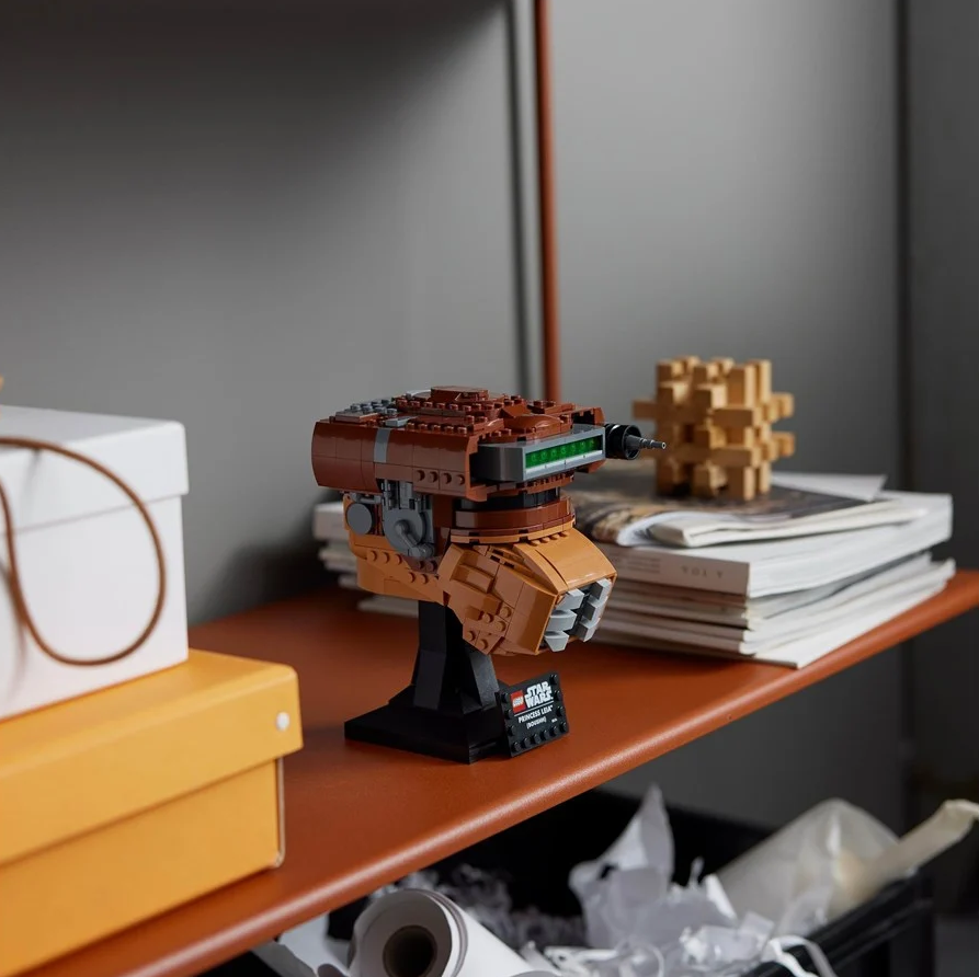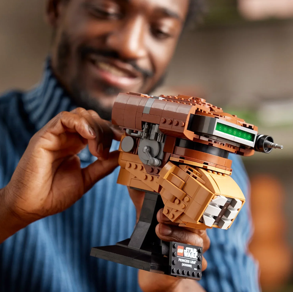 Pay homage to a legendary character with this LEGO Star Wars Princess Leia (Boushh) Helmet (75351) build-and-display model for adults. Channel your creative Force to recreate the bounty hunter helmet worn by Princess Leia as a disguise to enter Jabba the Hutt's palace in Star Wars: Return of the Jedi. A buildable stand with a nameplate completes an admirable centrepiece.