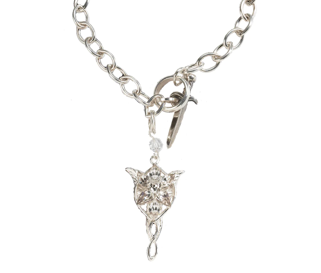 Inspired by the Lady Arwen's Evenstar pendant, this intricate chain-link sterling silver bracelet holds an Evenstar charm and has a toggle clasp with delicate dagger design.