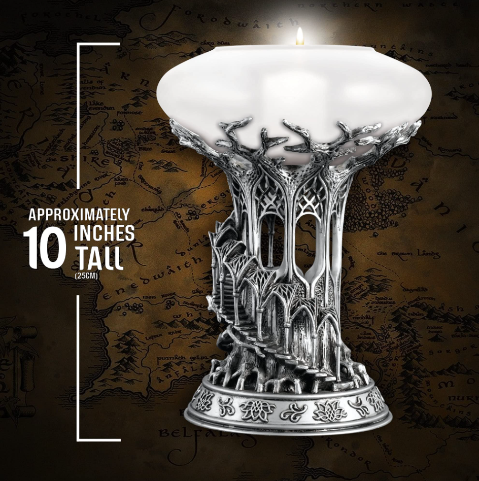 The exquisite spiral staircase and arches of the Lothlorien palace are recreated in this beautiful candle holder. The frosted glass top holds a variety of candle sizes and can be used to hold water and floating candles. 10 inches in height.
