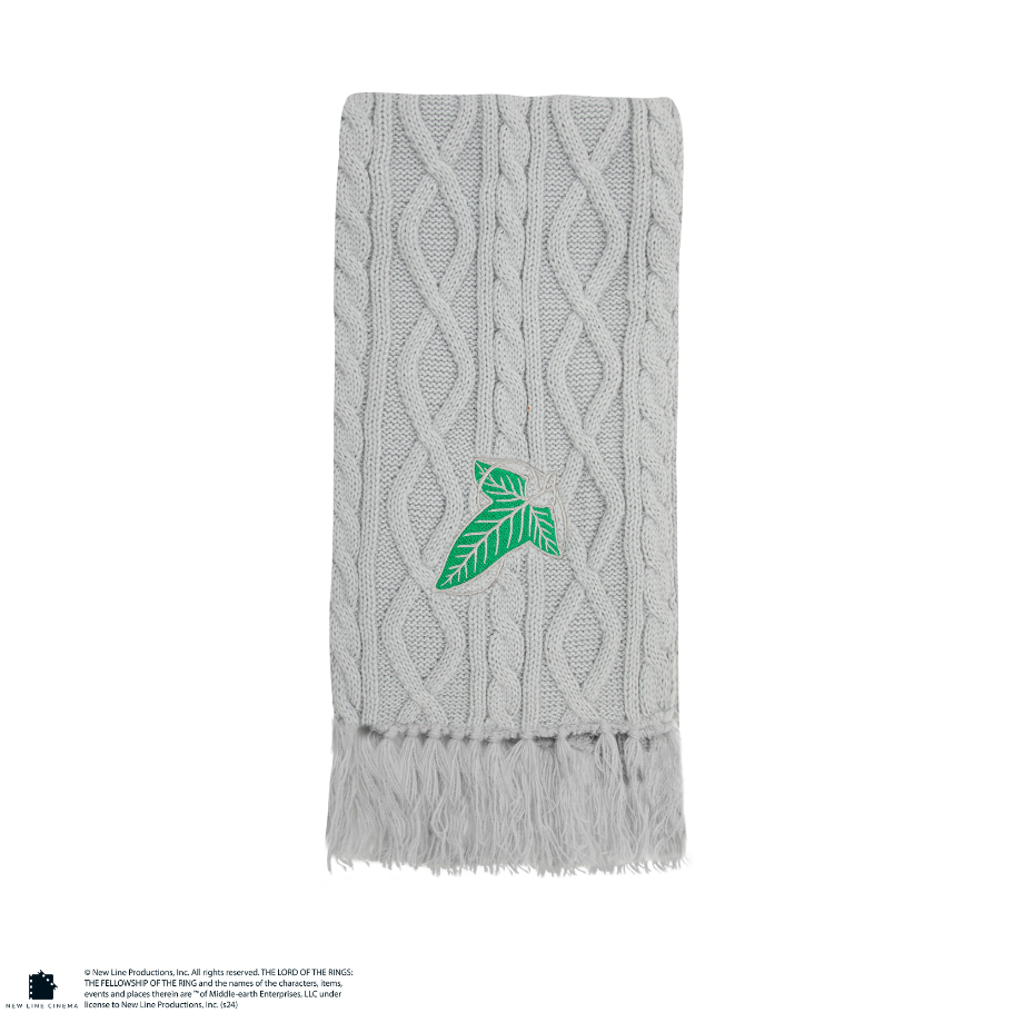 Crafted in a subtle shade of grey, this scarf is a tapestry of elven elegance and mystique. At one end of the scarf, the delicate green embossment of the Lorien Leaf is displayed, and on the other end, a ring of words intricately woven in the elegant script of Sindarin, the language of the Elves, weaves a tale of mystery and wisdom.