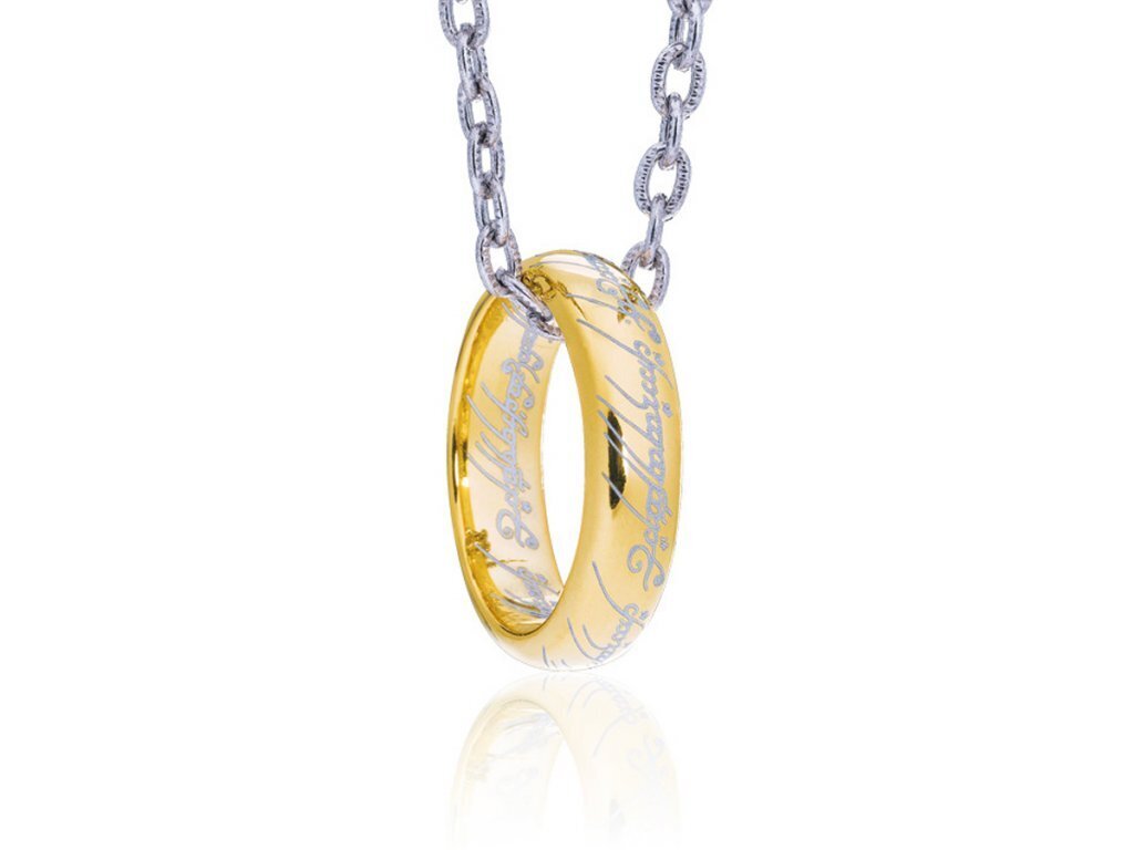 The One Ring is cast in sterling silver and richly plated in pure gold, featuring the inscription above in Elvish, an ancient language of Middle-Earth. This inscription is amazingly etched in full circle onto the inside and outside of the ring. Each ring is individually engraved with a laser process to capture the intricate details of the elvish writing and comes complete with a rich wooden collector's box and 20 inch (50.8 cm) chain.