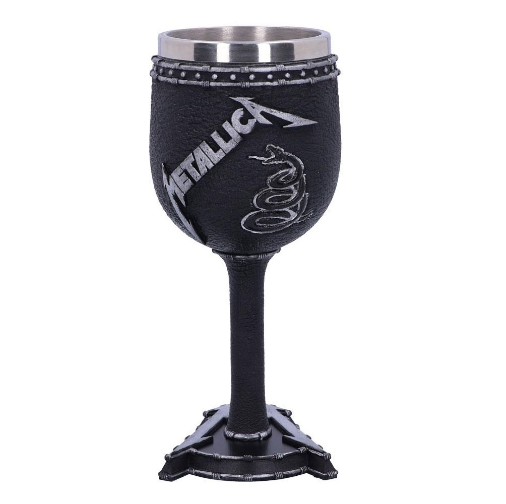 Have your favourite Metallica album artwork on display at all times with this exquisite Goblet, exclusively through Nemesis Now! Featuring the understated artwork from their self-titled fifth studio album, the Metallica logo sits above a coiled snake on a black background. The "M" from the logo is mirrored in the foot of the Goblet stem, which is cast in the finest resin before being expertly hand-painted. This piece comes with a removable stainless steel insert and is the perfect way to pay homage to one of the most influential heavy metal bands of all time!