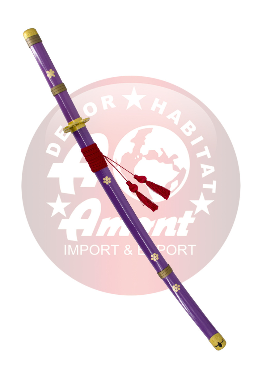 Replica purple katana Enma from One Piece with carbon steel blade. The scabbard is made of wood with a lilac finish and the stringing is red. One Piece Zoro Enma Katana unofficial replica finished in lilac, 103 cm steel blade finished in black with yellow and green cut details, with lilac sheath with gold details and red stringing, lilac handle with gold details. Starting with the cover of chapter 972 and volume 96, the tsuka became lilac.