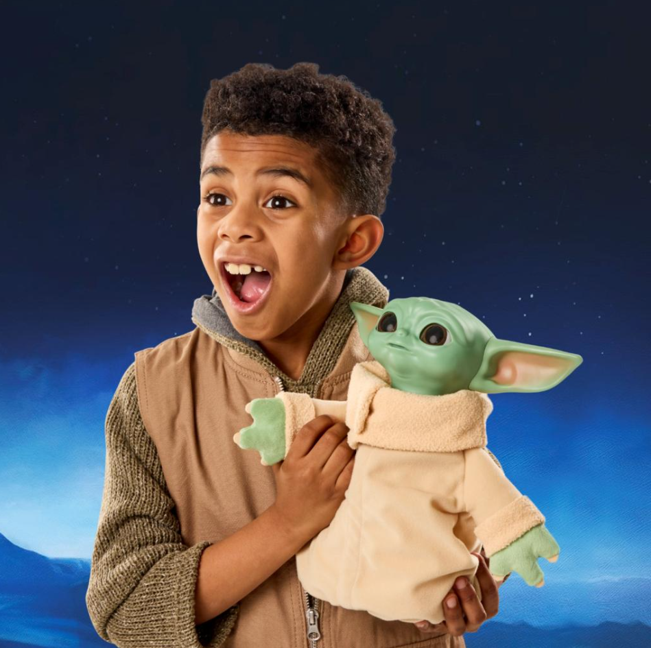 Epic adventures await kids and fans with this interactive Star Wars Grogu toy! With over 50 sound and movement combinations, this Star Wars toy is perfect for action-packed adventures and intergalactic bedtime cuddles. Pressing Grogu's head activates different reactions, such as moving his head, closing his eyes, and of course, making adorable sounds. This 10-inch animatronic Star Wars plush has a soft body, allowing kids to cuddle Grogu after a day of play. It's ready to play right out of the box thanks to the 3 included AA batteries. There are other Grogu and Mandalorian toys inspired by the movies available for Star Wars fans aged 4 and up. (Sold separately, while supplies last.)