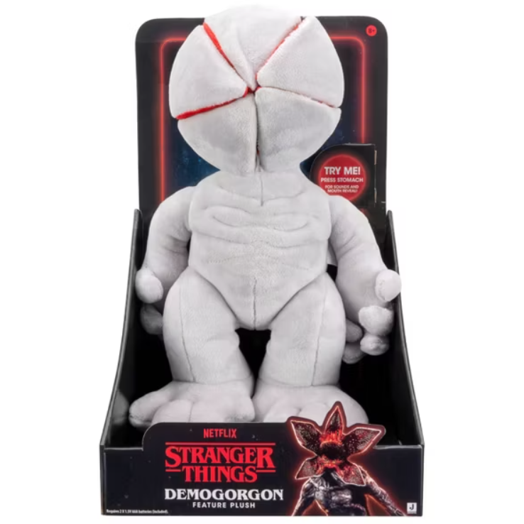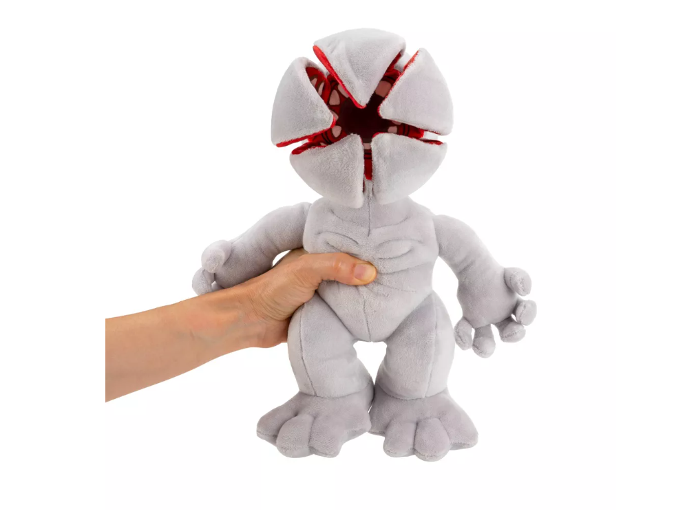 This super soft 30 CM plush is based on the gruesome monster from the first season of Stranger Things. Squeeze the torso to open up its closed head and watch it bare its terrifying mouth and teeth. When it opens the plush plays unique Demogorgon sound effects. Release the torso to close the head back up.