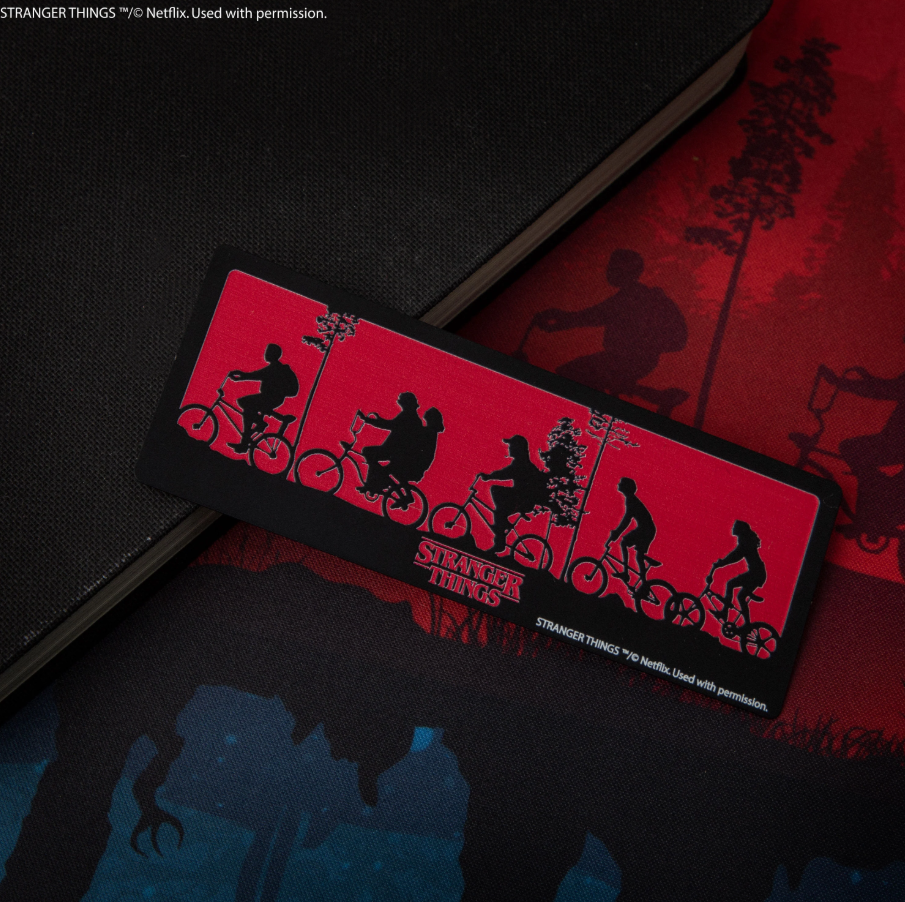 This bookmark is adorned with a sleek black silhouette cutout that captures the essence of the iconic gang from Stranger Things riding their bicycles, and offers a timeless and stylish touch to your reading adventures.