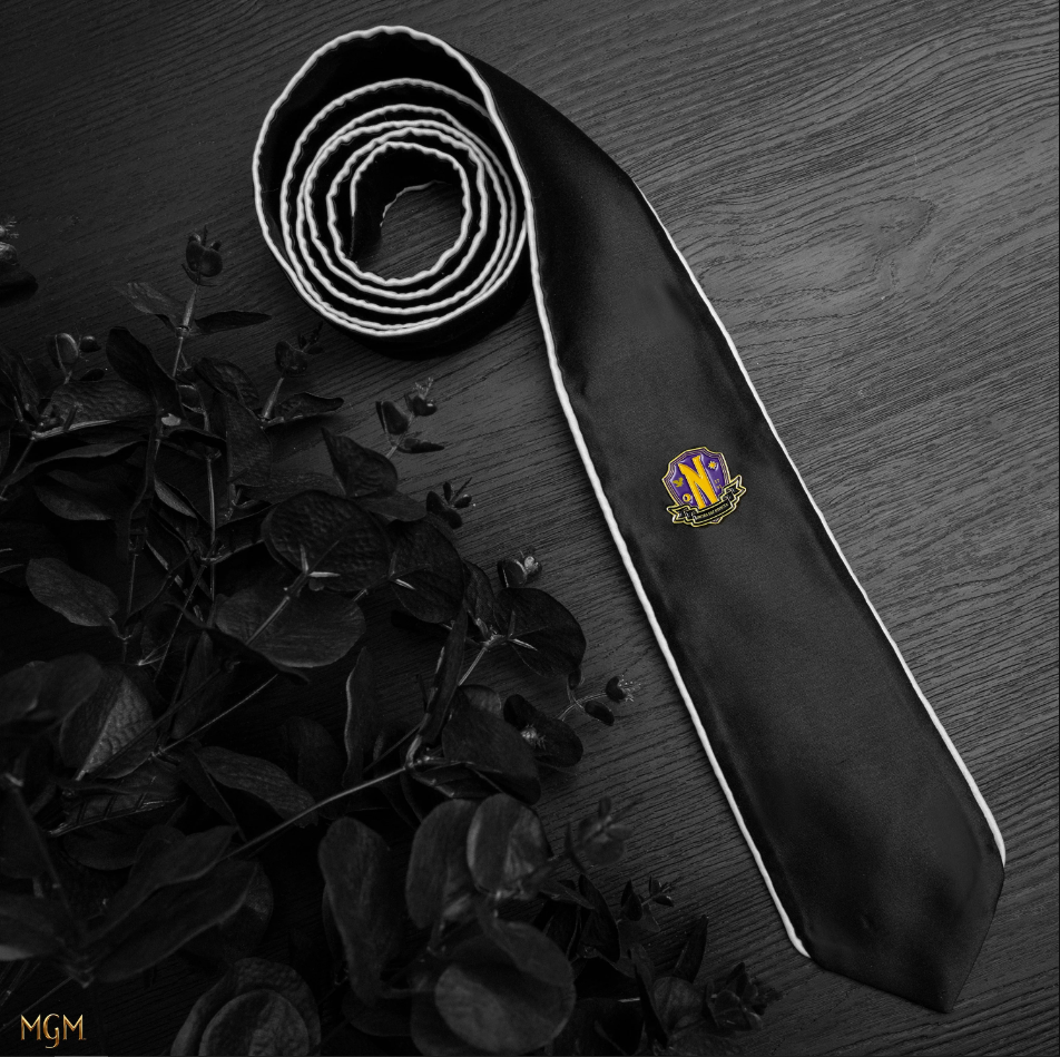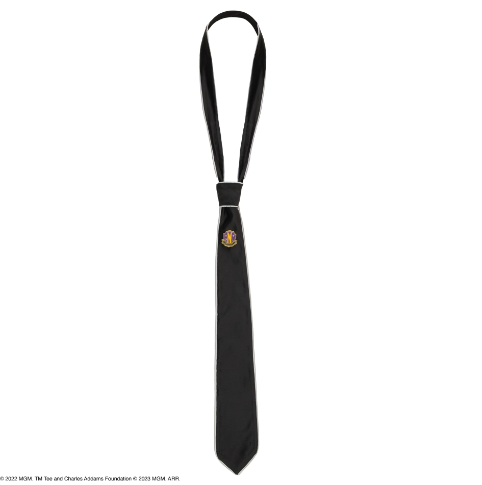 This tie and pin set is suitable for both costume and day-to-day use such as work. It features the exact same necktie from the Nevermore Academy uniform and exudes a sense of dark sophistication that will captivate any Addams Family enthusiast.