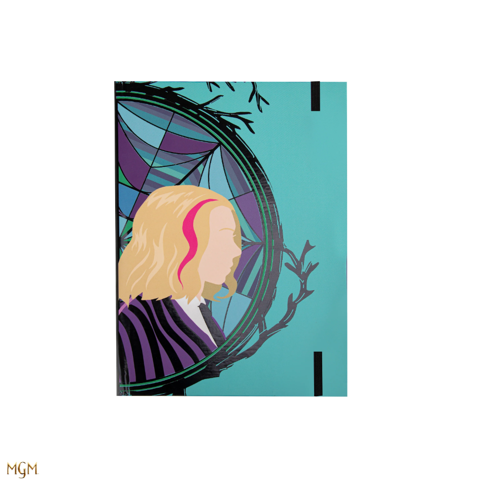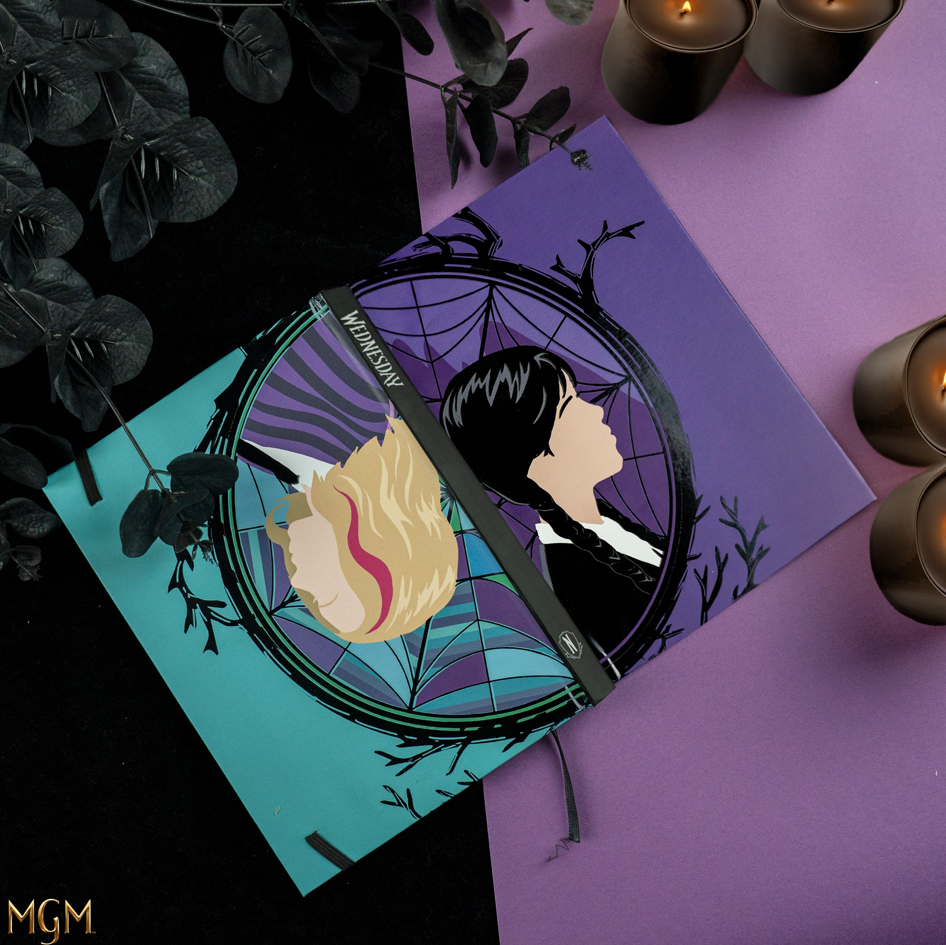 This notebook displays stunning side-profile illustrations of Wednesday and Enid in front of their respective sides of the stained glass window. And that's not all - you'll also find a blue and purple striped pocket at the back to help you store loose bits of paper. The hardcover construction and high-quality paper make it perfect for all your creative needs.